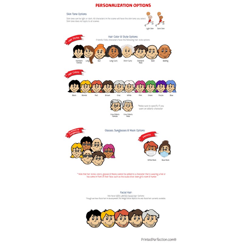 - Glasses (clear or sunglasses) and/or masks can be added to most characters.