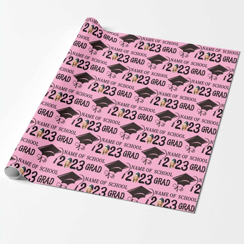 Personalized Photo Wrapping Paper for Graduation, Custom 2023 Grad Cap with Face Pink Wrap Paper Roll for Boys Girls Baby Shower Customized Birthday Graduation Gift for Daughter 58x23 Inch 2 Rolls