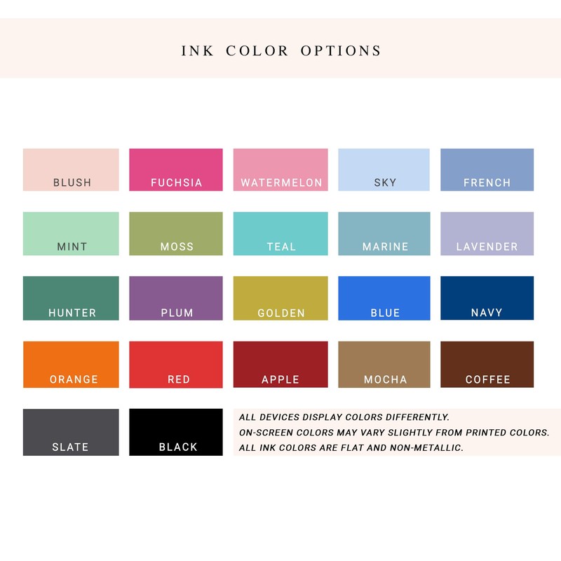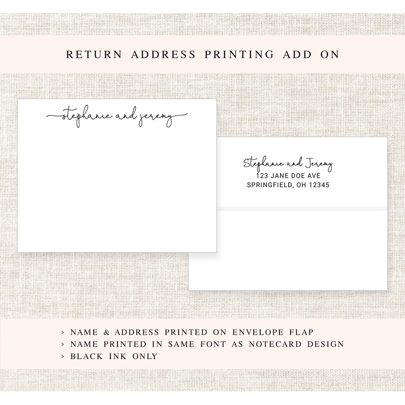 - CUSTOMIZATION - Select the "Customize & Add to Cart" button to enter the name / text you want printed. The name will be printed in the font shown in the pictures. Next, select an envelope color from a list of envelope colors and choose ink color from the dropdown options. The return address printing is an optional add-on. To include this option, enter the name and address to print on the back flap of the envelope.