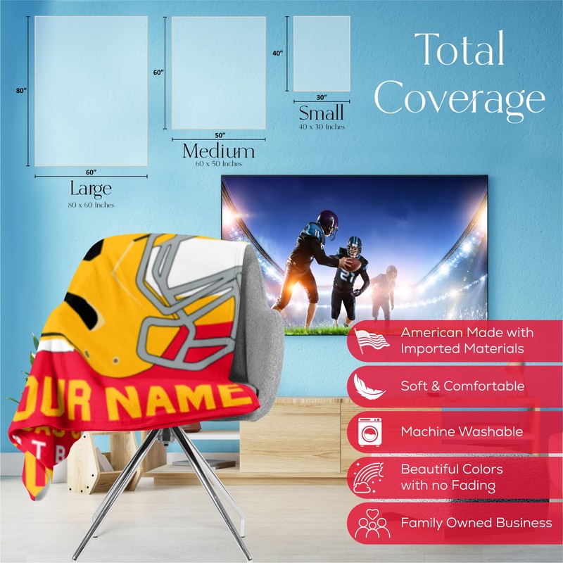 Looking for the perfect gift for a football fan or player? Look no further than this custom football fan throw blanket! This football-themed fleece blanket is a must-have for any football enthusiast, featuring personalized name, helmet number, and a unique design that showcases their love for the game. Whether it's for a high school football player or a die-hard proffessional football fan, this blanket is sure to be a touchdown!