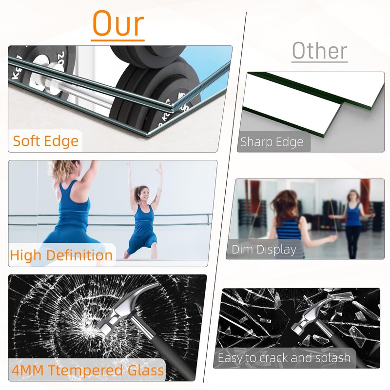 - 【Exceptional Premium Materials】PERTETEY frameless gym mirror is made of HD tempered glass, shatterproof, explosion-proof and safer to use, no worry the mirror breaking into pieces. Durable high-quality and anti-rust design make it ideal for home use;