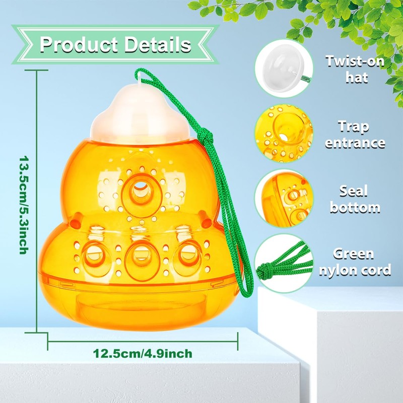 - EFFECTIVE & NEW DESIGN WASP TRAPS - The wasp trapper is designed with 8 entrances, and the multi-entry design can increase the chances of attracting insects into the trap. The wasp repellent outdoor has a large entrance but a small exit, and a wasp entering a yellow jacket trap will not be able to escape. The hornet trap has multiple small holes distributed around the entrance to help distribute the scent of the bait and more effectively attract and capture wasps, yellow jackets etc