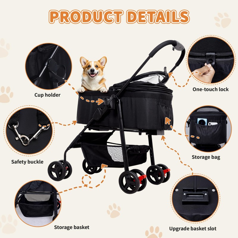 - 【Innovative Storage Solutions】Includes a bottom storage basket with plenty of capacity to hold pet snacks, water cups, and other miscellaneous items, and comes with a stable side cup holder to make it easier for you to drink and make every outing a perfect one. Whether you're walking your dog on a daily basis, out shopping or on a long trip, this pet stroller makes it easy