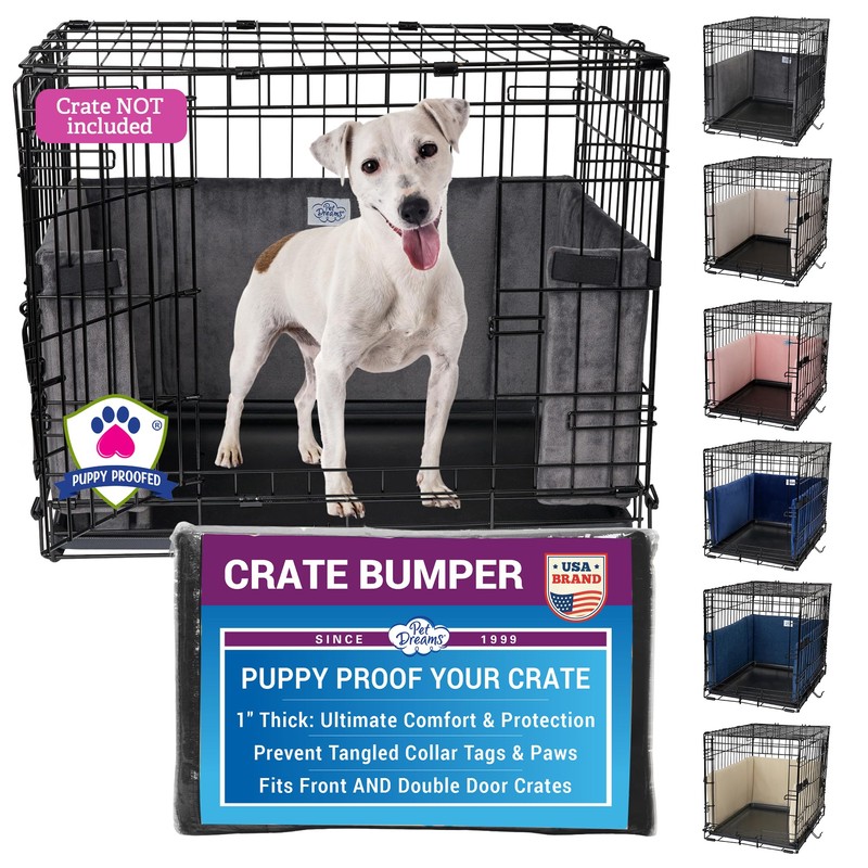 - Puppy Proof Your Crate! Our dog crate bumper wraps securely around the inside of the crate, providing a cushioned barrier that ensures your dogs safety and comfort. Tall enough to prevent collar tags and paws from getting tangled in the metal bars, our bumpers also protect wagging tails from smacking against the crate. More than just protection, this padded liner transforms the crate into a cozy, inviting retreat, helping your dog feel safe, secure, and comfortable. Whether for a playful puppy or a full-grown dog, our crate bumper ensures peace of mind while making the crate a warm and welcoming space.