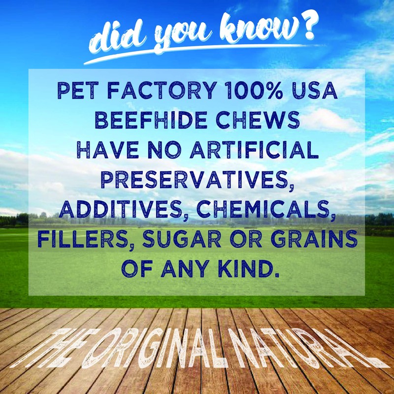 - FOOD SAFETY: Pet Factory beefhide chews are made in our Global Food Safety Initiative-certified manufacturing facility, which gives customers peace of mind in knowing that our products are produced under optimum safety and quality conditions