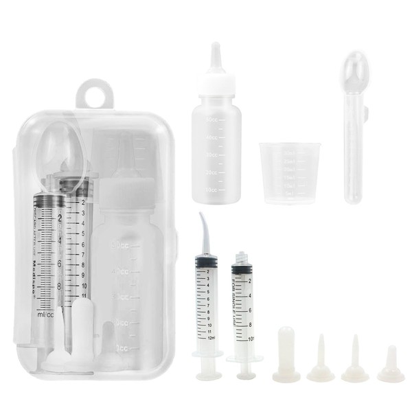 - Pet nursing kit includes 1 x 10ml feeding syringe and 1 x 12ml elbow syringe, 5 different sized silicone nipples, 10ml syringe spoon, 50ml kitten bottle, 30ml measuring cup.