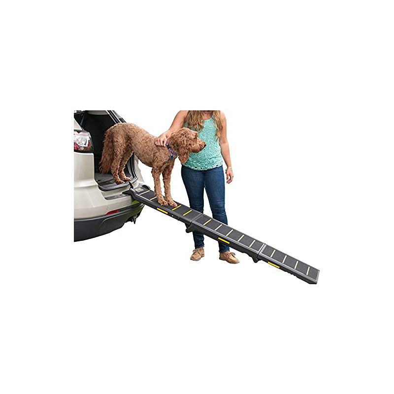 - High-visibility reflective material aids in guiding your pet up and down the ramp