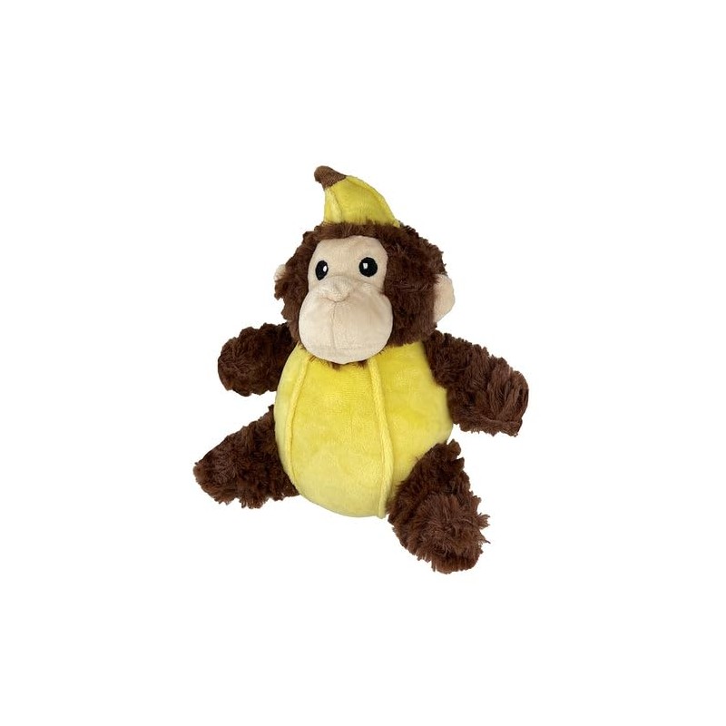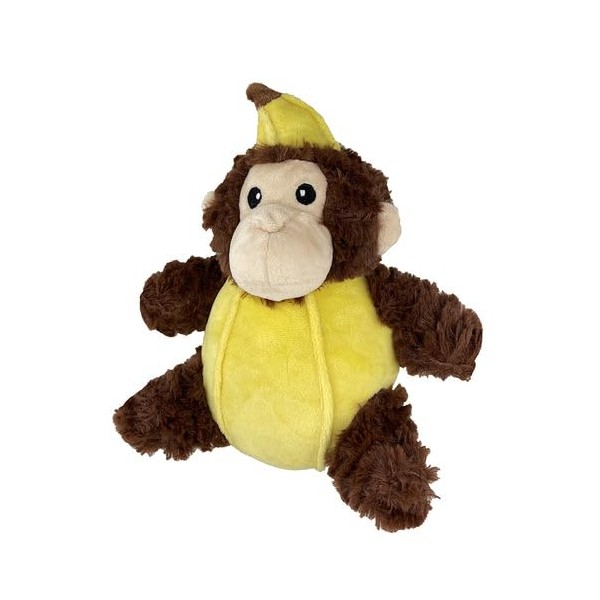 - 8" long cute monkey-shaped dog toy wearing an adorable banana costume.