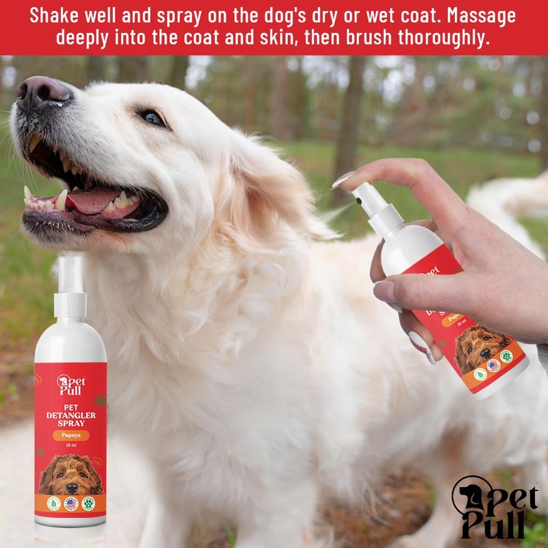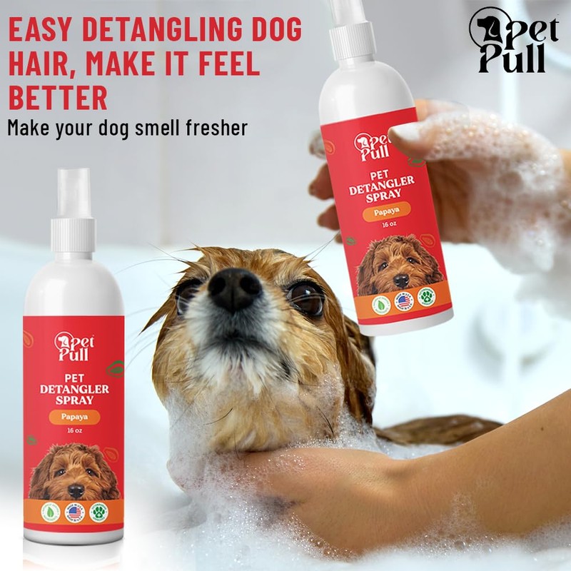 Pet Pull Detangler Spray - Dog Grooming Puppy Detangler Spray to Comb Through Knots, Mats, and Tangles - Detangling Spay for Dogs Pet Papaya Scent - Made in The USA (16 Oz)