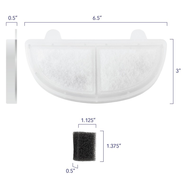 - [Premium 6 Pack Pet Fountain Filters] 6-pack of premium pet fountain replacement filters and 3 Pack of pre-filter sponges individually packaged and sealed to maintain high quality. Enough supply for 3 to 12 months of use. Replace the pre-filter sponge every 4-6 weeks.