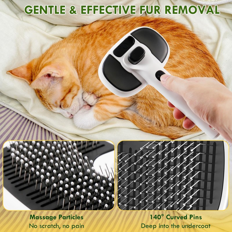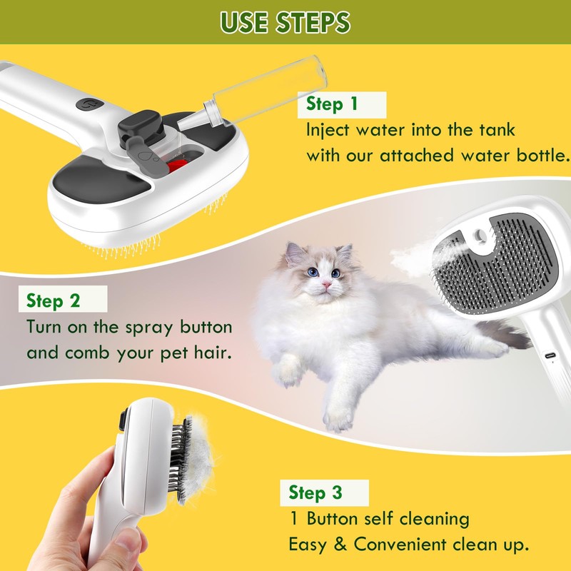 - 4 in 1 Pet Steam Brush: Our Pet Steam Brush combines de-shedding, steam spray, self-cleaning, and massage functions into one.It quickly removes loose hair, prevents mats, and leaves your pet's coat super soft and smooth.