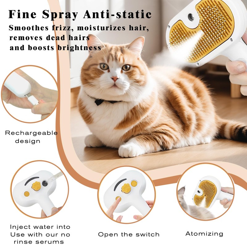 - 1. Multi-Function Pet Grooming Tool This pet steam brush combines de-shedding, steam spray, self-cleaning, and massage functions into one. It effectively removes dead skin and loose hair from your pet’s coat, reducing tangles and matting, and keeps their fur smooth and soft. Suitable for both long-haired and short-haired cats, it meets all your daily grooming needs, helping to reduce the frequency of baths while maintaining your pet’s skin and coat health.