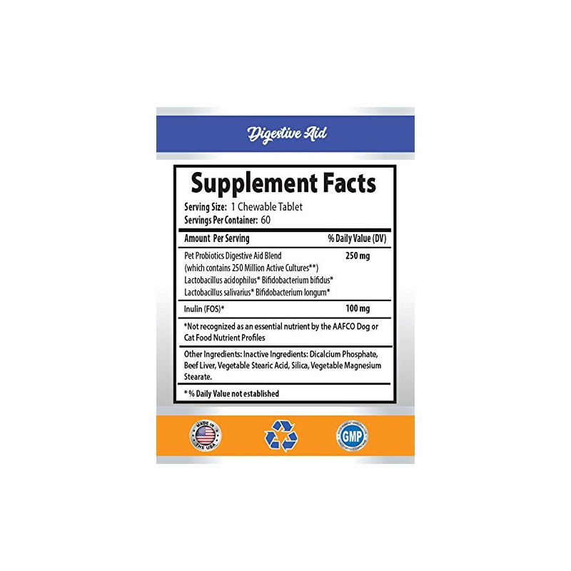 - PET PROBIOTICS DIGESTIVE AID: This Digestive Aid Probiotics for pets delivers 250 million cultures from 4 probiotic strains in each chewable tablet. We added a special savory beef flavor to our formula that your pet will love so much, they'll be convinced its a delicious treat! Our advanced formula eatures Lactobacillus acidophilus bifidobacterium bifidus, Inulin (FOS), and much more, support your pets healthy digestion naturally at a great value and price.