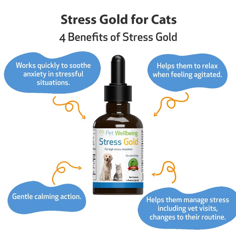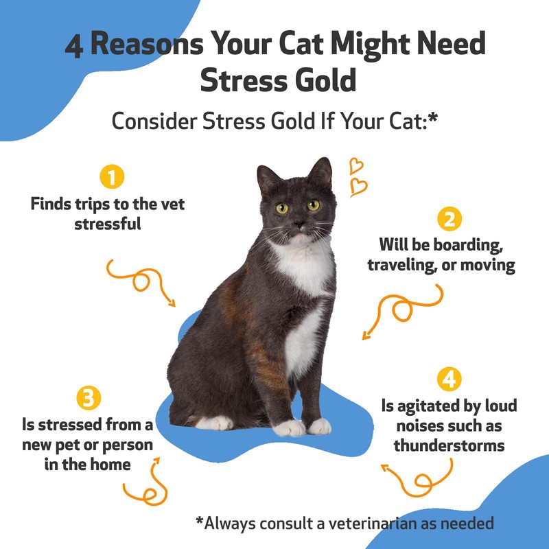 - ✅ STRESS SUPPORT. If your cat is stressed, such as from a new pet or person in the home, Stress Gold helps support their nervous system and stress response. This can help them better adjust to new situations.