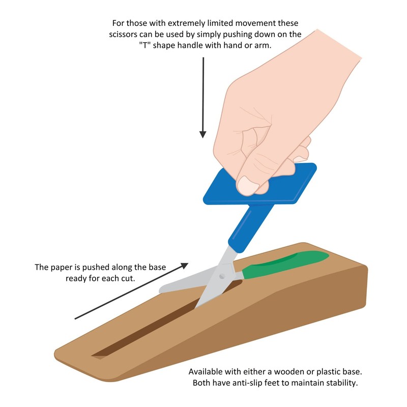 Our Mounted Table Top Scissors are designed for use by those with very limited strength and control, or for use one-handed. Simply push the paper or card along the base until in position, then push down the "T" shaped handle to cut.