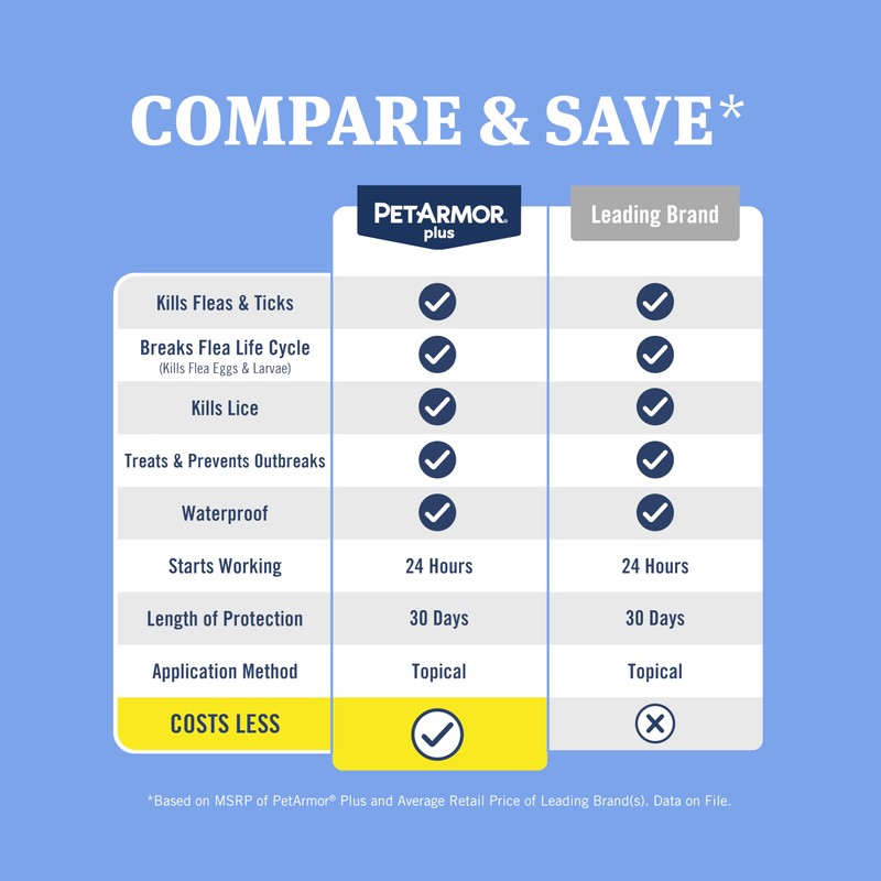 Your pets are family, and PETARMOR helps you confidently care for your dog, especially when it comes to flea and tick control. PETARMOR plus conveniently provides vet-quality protection without the expense of a vet visit. PetArmor Plus Flea and Tick Topical For Large Dogs 45-88 lbs., 12 weeks and older is a waterproof, fast-acting, long-lasting formula that kills adult fleas and ticks plus stops the flea cycle dead in its tracks. This dog flea treatment has the same active ingredients as FRONTLINE? Plus for Dogs. Get nose to tail 30-day protection with each dose at an affordable price. One single-dose package of PetArmor Plus Dog Tick and Flea Treatment offers one month of continuous coverage for all breeds.