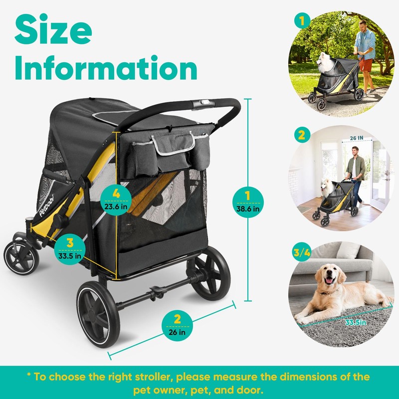 - Safety and Storage: Equipped with adjustable safety leashes for multiple pets and a spacious storage bag under the handle, this double stroller ensures safety and organization for all your pet supplies, including water bottles and phones