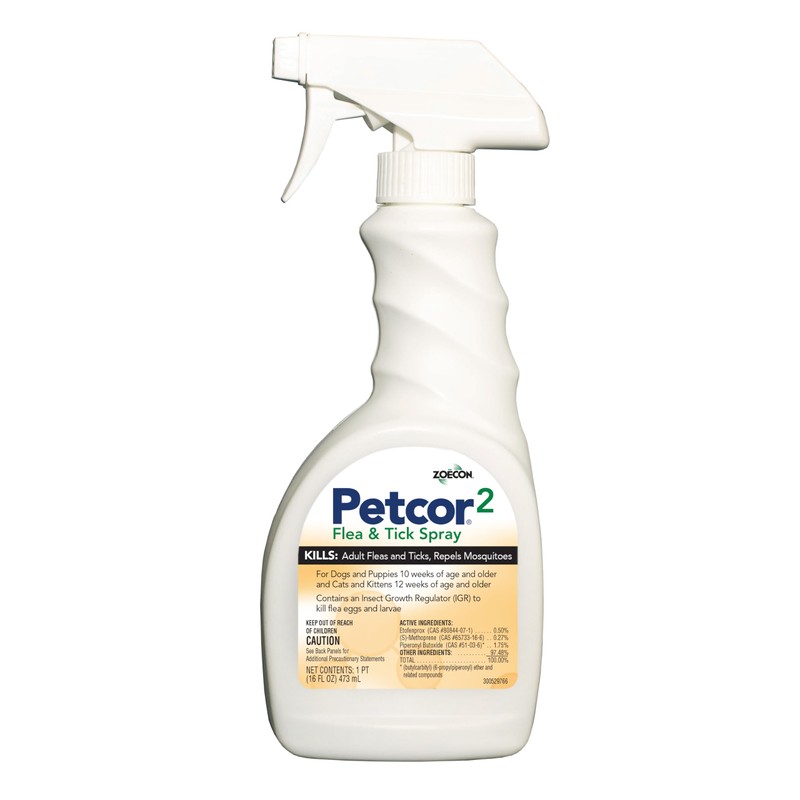 Petcor 2 Flea & Tick Spray is an easy-use spray designed to kill ticks, lice, fleas, and mosquitoes on dogs, cats, puppies, and kittens. It provides your pets with immediate relief from insect bites. Its Insect Growth Regulator (IGR) kills flea eggs and larvae continuously. Prevents further infestations for up to 63 days. Safe to use for dogs and puppies ten weeks old and above. Also safe for cats and kittens 12 weeks old and above. A light, even coverage is enough to provide effective flea control. Best re-applied every two months to prevent infestations. Available in a 16-ounce bottle.