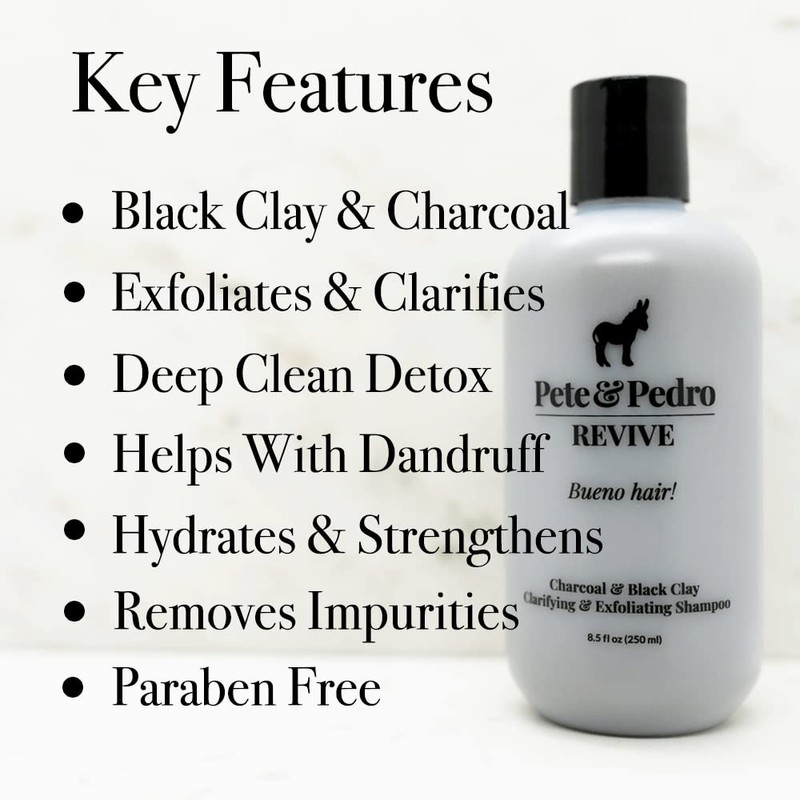 - Black Clay & Charcoal: Revive Shampoo has a perfectly balanced combination of Black Clay and Charcoal that not only removes impurities in the hair follicles and scalp, but also strengthens hair and reduces dandruff, flakiness, and irritation.