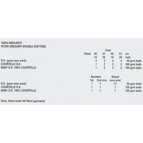 • This baby double knitting pattern leaflet 675 by Peter Gregory will guide you in creating a shawl, coat and bootees. The coat and shawl are knitted in the same design and you can make a pair of bootees to match.