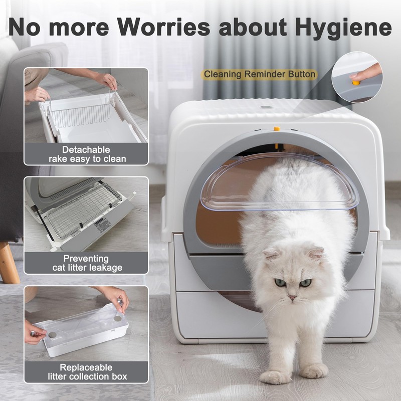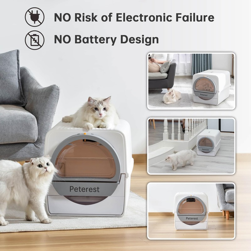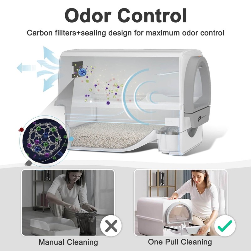 Spacious Design for Comfort & Hygiene.Extra-Large Size: 25"L x 18"W x 18"H interior gives even 18 lb cats room to turn and dig naturally.7-Day Waste Capacity: 13"L collection box holds waste from 2-3 adult cats for a full week – perfect for busy pet parents!Effortless Semi-Automatic Cleaning.Pull-and-Scoop System: Simply pull the lever to sift waste into the sealed compartment – no electricity, no complicated buttons.30-Second Cleanup: 5x faster than traditional scooping (and no back strain!).Advanced Odor Lock Technology.Triple Sealing: Tight lid + rear carbon filter + airtight waste bin trap 99% of smells.Included Premium Clumping Litter: Absorbs & dehydrates waste instantly, keeping paws and floors clean.Safe & Silent Operation.No Motors, No Noise: Ideal for skittish cats and late-night cleaning.Non-Toxic Materials: BPA-free plastic ensures pet safety.