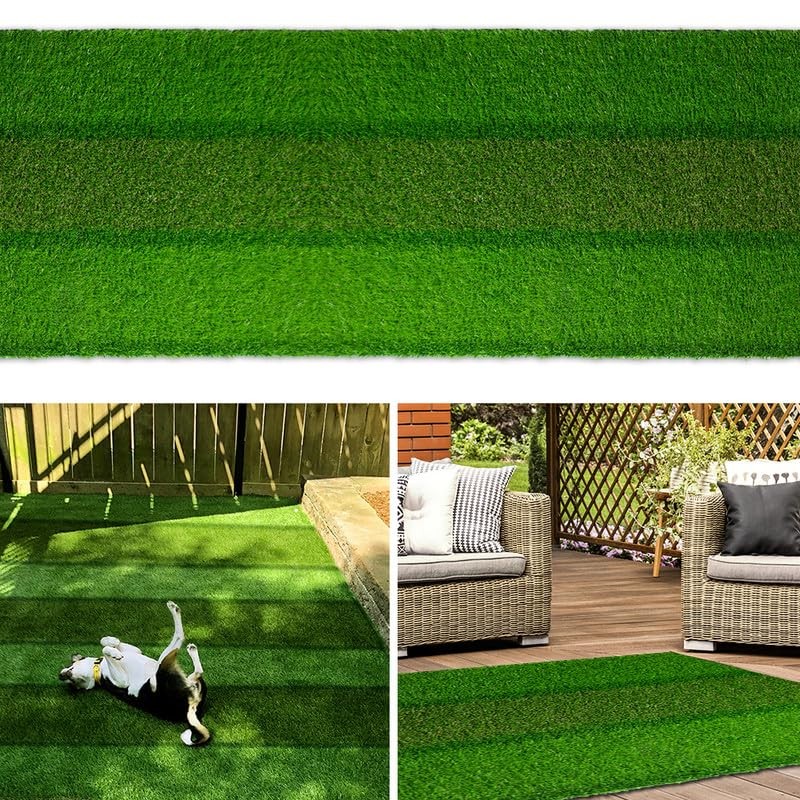 - REALISTIC ARTIFICIAL GRASS RUG: High-density artificial grass, soft and lush, made with four-tone grass yarn, it looks and feels like natural grass. This synthetic grass mat carpet provides you with year-round green and turf enjoyment. The lush fake grass area rug runner allows you and your pet to experience the fun of the outdoors.