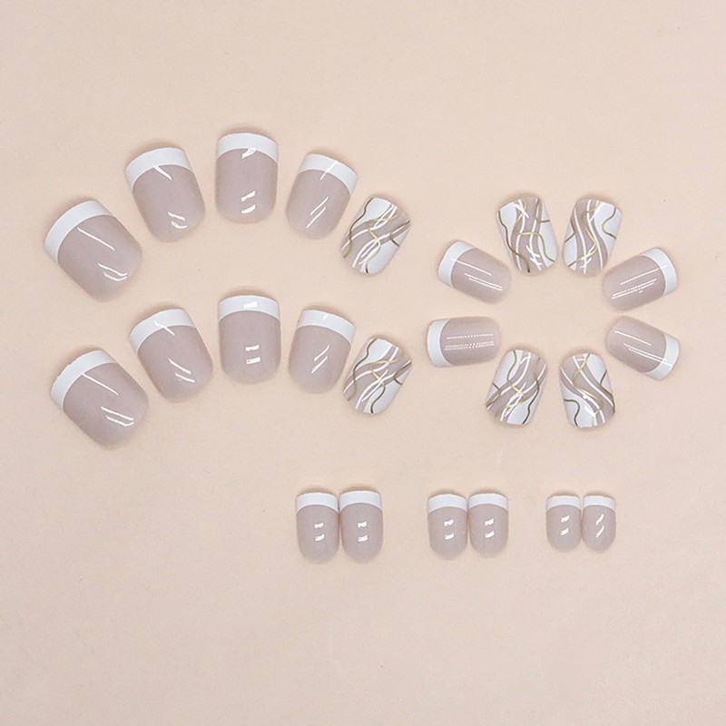 Petite Press on Nails Short Square SWEKKE French Tip Fake Nails White Full Cover White Swirl False Nails with Designs Gold Line Glossy Glue on Nails Acrylic Nails Artificial Nails for Women Girls 24Pcs