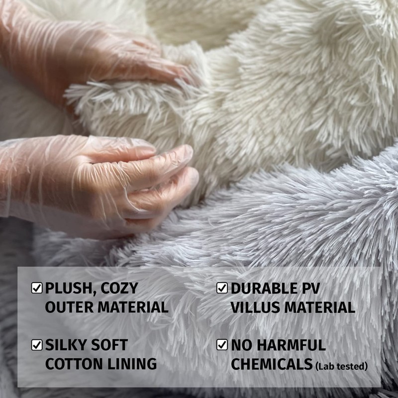 - 🐶 SECURE & COMFORTABLE: This cozy, soft, and plush fuzzy dog bed is ergonomically designed for your pet’s comfort. Designed as an anxiety bed for pets, the round shape helps your pet curl and burrow like it would in a natural environment, and the raised rim provides head and neck support. Also, super-soft filling offers joint and muscle pain relief. PETORO dog bed provides a full sense of security for your pet.