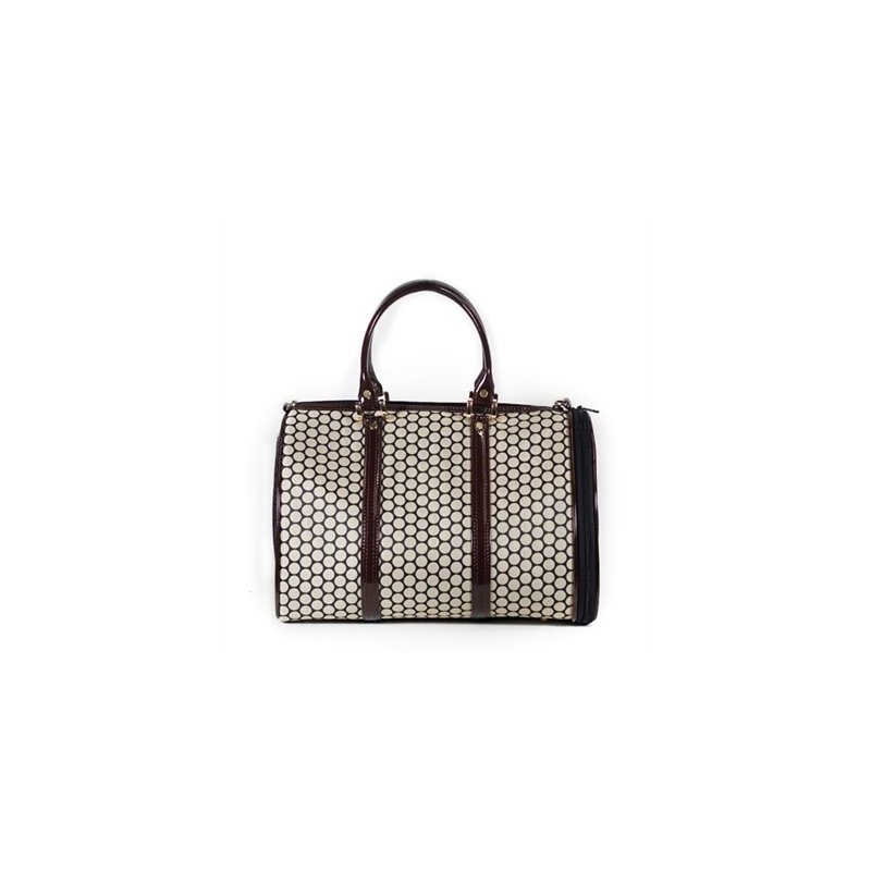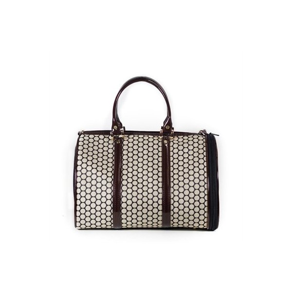 The JL Duffel is so cute!!! Just the right size carrier for your tiny teacup pocket puppies! Made from stylish noir dot canvas and shiny brown trim. The JL Duffel is lightweight and super stylish! In fact it looks just like a chic designer handbag. Mini JL Duffel will fit dogs or cats up to 8 lbs.; Regular size for dogs or cats up to 15 lbs. The JL Duffel features easy top load zipper as well as new side zip entry, top handle as well as adjustable, detachable shoulder strap, roomy inside pocket, removable faux fur bedding and signature silver hardware. Vented on both ends. Airline approved. Made in the USA.