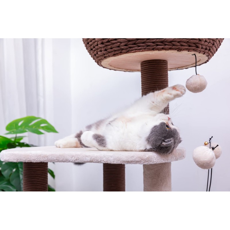 - FEATURES: Teasing toy, weaved bowls, paper rope posts and plush covers