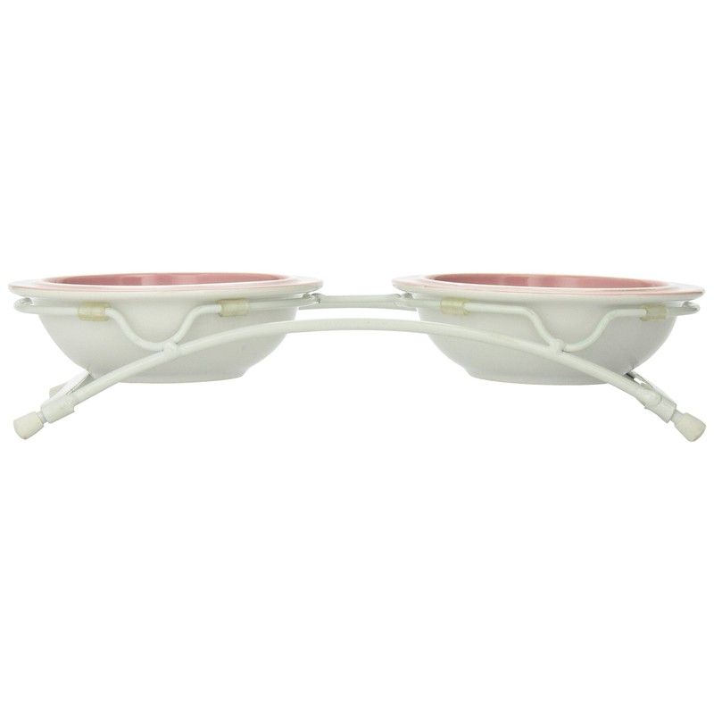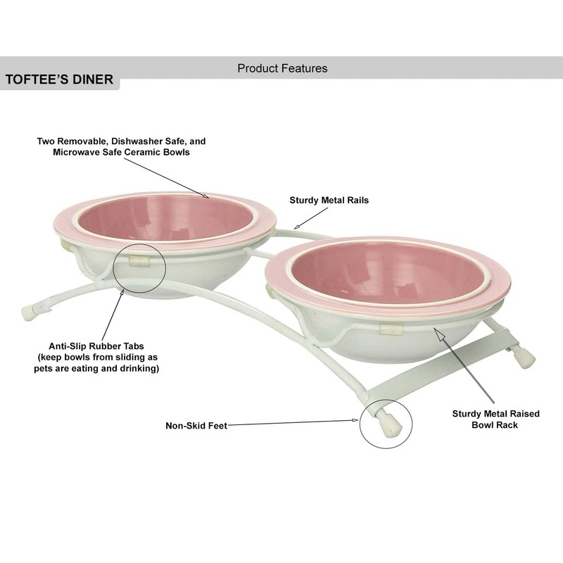 PetRageous 44355 Toftees Paws Diner with Two 1-Cup Dishwasher Safe Stoneware Bowl Capacity 10.75-Inch Length 2.25-Inch Tall for Extra Small and Small Dogs and Cats, White and Pink