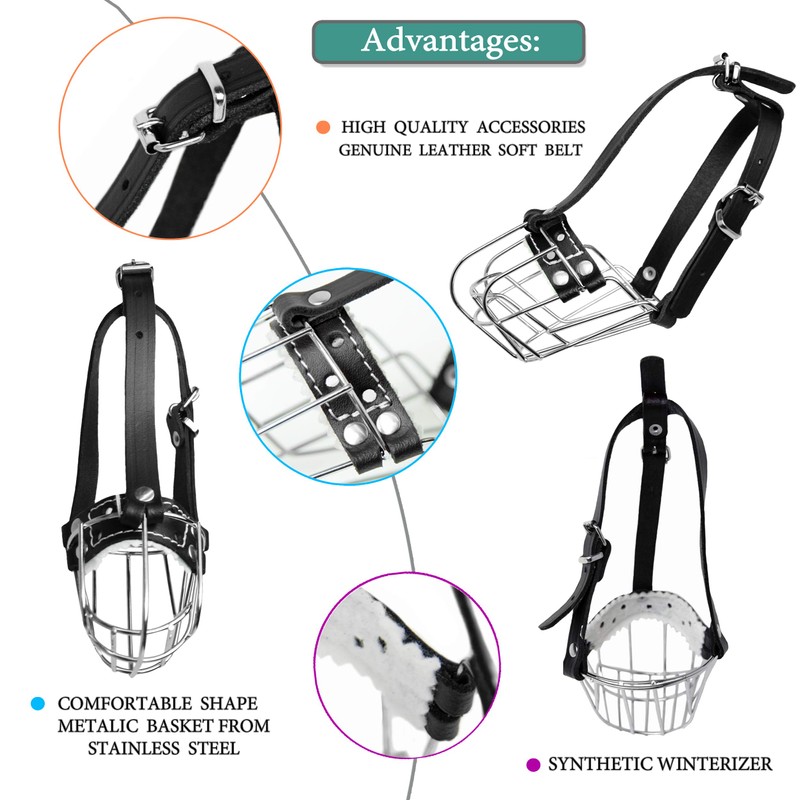 - The muzzle for dogs is made of genuine leather, synthetic winterizer and metal.