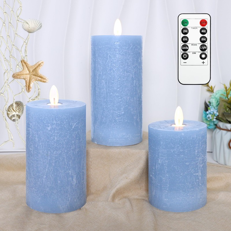 - The Pillars controlled by included remote,powered by 2AA batteries and offer 200+ hours romantic ambiance, moving-flame candlelight. Poured in a silver blue wax color with a seaglass texture finish, the Pillars are available in 3 assorted sizes that can be grouped together in staggering sizes, for the perfect lighting accent that adds an elegant ambient glow to your home.