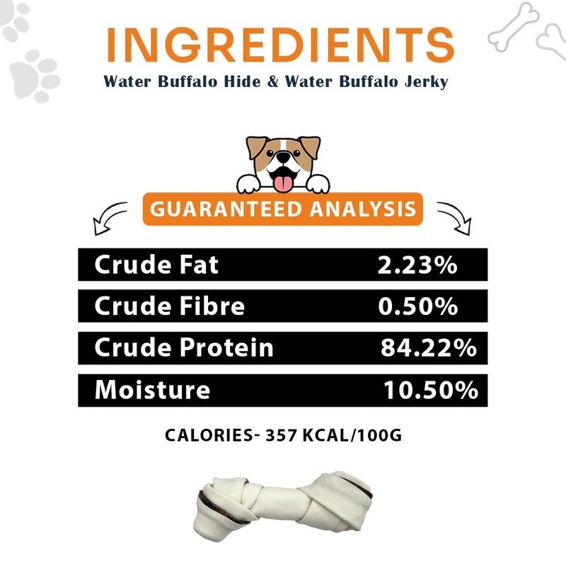 - Protein-Rich Treats: These jerky with rawhide knotted bones are a protein-rich, grain-free, and grass-fed water buffalo chew for dogs.