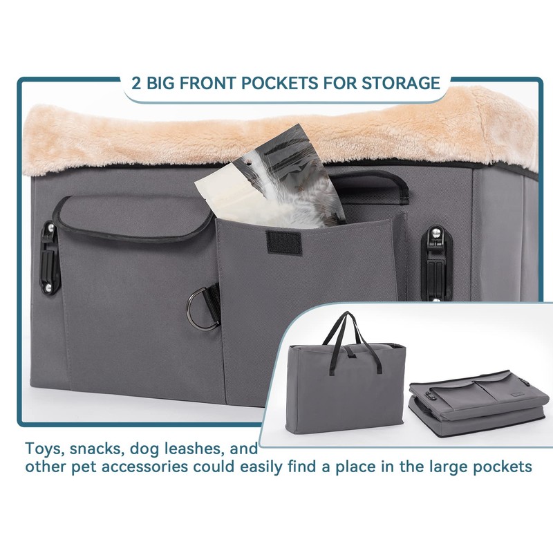 - [Easy to use] Easy to store when not in use thanks to the collapsible design, sturdy construction, and quick installation and removal in the backseat of a car. There are 2 storage pockets that can transport the daily needs of a pet. Additionally, the dog car seat has an adjustable buckle design which is suitable for a variety of car types and can be quickly installed on most standard car seats.