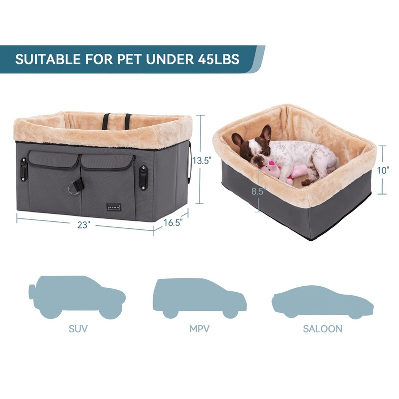 - [Sizing] With dimensions of 23" L x 16.5" W x 13.5" H, the dog booster car seat is suitable for a medium sized dog up to 45 pounds or 2 small pets. Please measure your pets before making a purchase to choose the ideal dog car seat size.