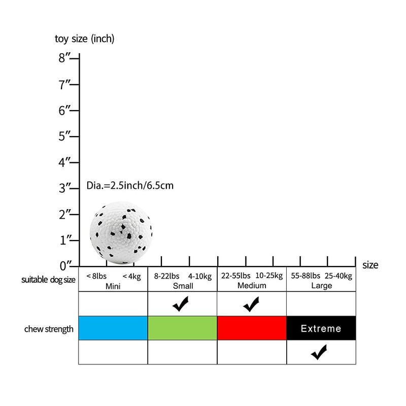 - Size Chart – Please make sure this ball is larger than the width of your dog's mouth to avoid accidental chocking or swallowing, proper supervision is advised. This dog toy is recommended for aggressive chewers up to 35lb or larger dogs with moderate chewing behavior.