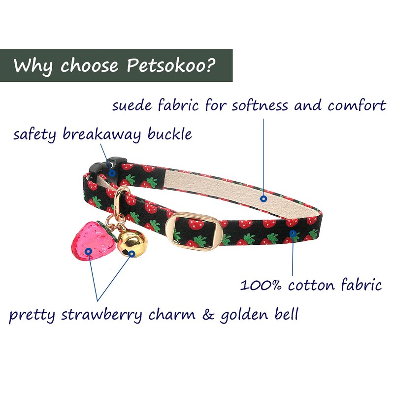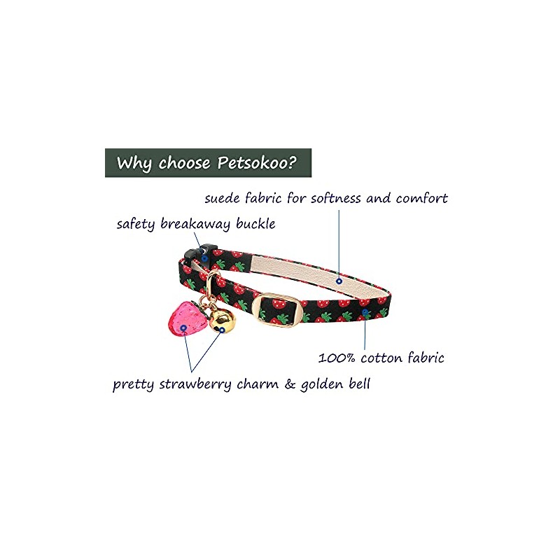 PetSoKoo Cute Cat Collar with Bell and Strawberry Charm.100% Cotton.Safety Breakaway Soft.for Girl Boy Male Female Kitten Collar