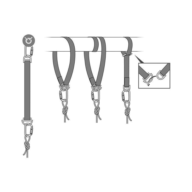 • Offers several configurations for setting up an anchorage: directly on an anchor. around an anchoring structure, choked on an anchoring structure, thanks to the different sizes of the attachment points