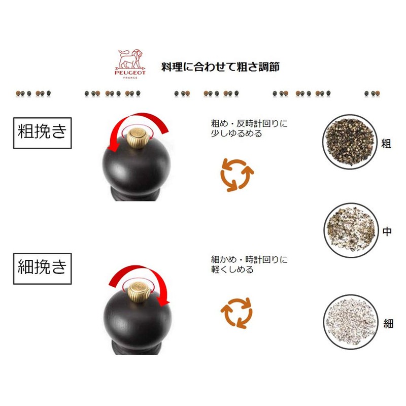 The primary difference between Peugeot and all other brands are the spice- specific mechanisms. Peugeot has 7 unique spice specific mechanisms for pepper, salt, herbs and spices, coffee, wet salt, chili peppers and nutmeg. For each spice, there is one - and only one - Peugeot grinding mechanism, each made of the ideal design and constructed from the best material available for its intended use. All Peugeot mechanisms are made in France and carry a lifetime limited warranty.