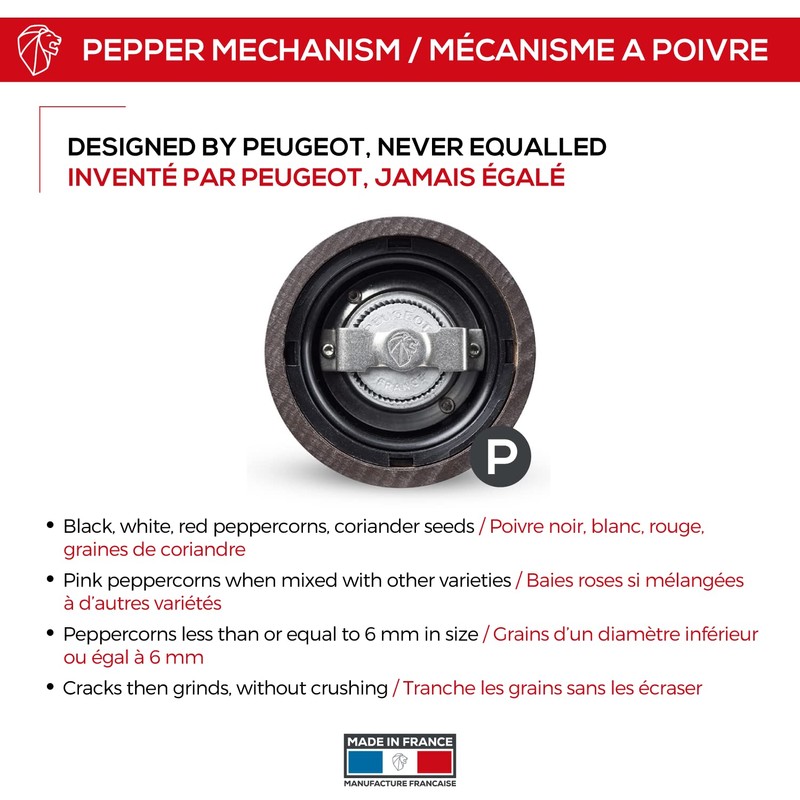 - ICONIC PEPPER MILL — The chocolate-colored Paris u’Select pepper mill enhances the flavors of the meals that you create. Precise and even grinding are the key words for this emblematic mill by Peugeot. Engineered and manufactured in France