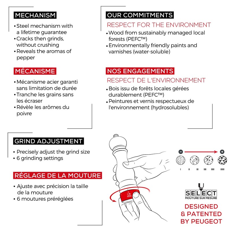 - ENHANCE FLAVOR — The u’Select mechanism brings out all the aromatic depth of pepper by selecting the right grind for your taste. Very finely ground pepper will bring out its spice, whilst a coarser grind will highlight its aromas and flavor. Find your Peugeot moment and enjoy the art of French living with our instruments of taste