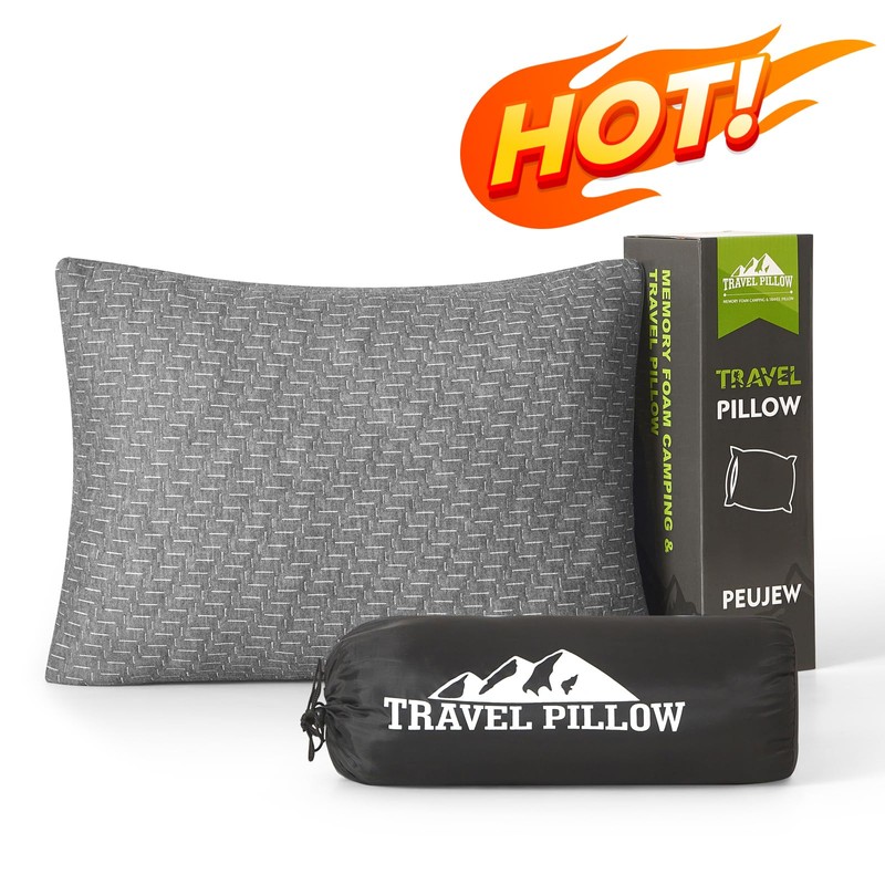 - 【Compact and Portable】PEUJEW camping pillow measures 12* 16 inches in size, featuring a compressible and portable design with a practical travel bag. It easily attaches to luggage or hangs in the car, making it ideal for business travelers, campers, and backpackers