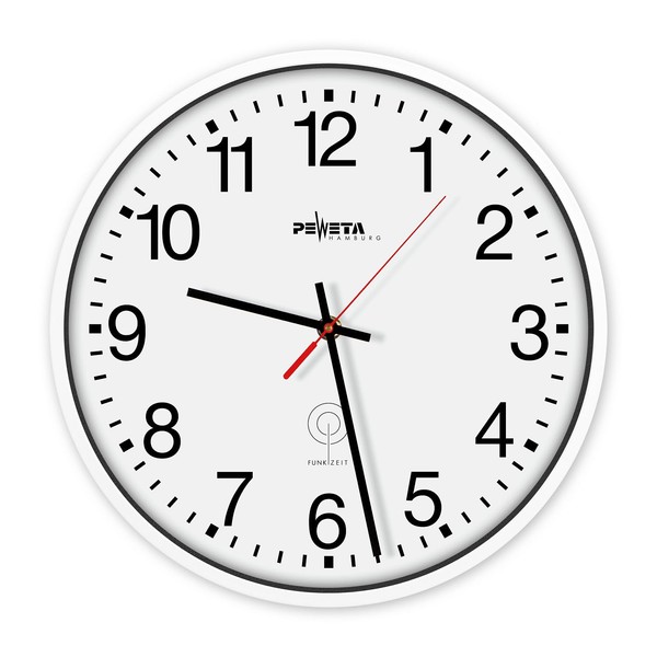 The plastic radio wall clock from Peweta is a factually solid, analogue radio clock for wall mounting with Arabic numbers or bars in an attractive design. The case provides protection against contact with tools, wires and similar with a thickness of > 1 mm. It also protects the watch from grain-shaped foreign bodies with a diameter > 1.0 mm.