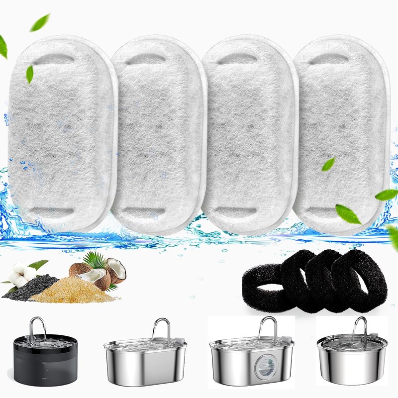 PewinGo Cat Water Fountain Filters,Replacement Pet Water Fountain Filter for 2L/3.2L/4L Cat Water Fountain,4 Triple Filtering Filters & 4 Foam Sponges