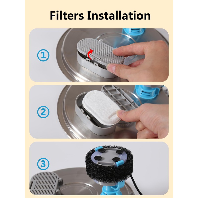 - 【Easy to Use】Just put the raised side up and the flat side down, easy to install. Rinse cat fountain filter with running water thoroughly for 1 minutes before use.Replace water filters for cat fountain every 2 to 4 weeks.