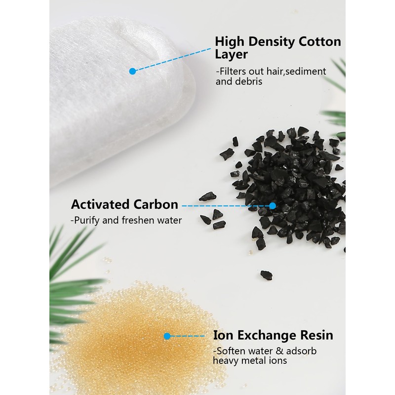 - 【High Quality】Our fountain filter newly added the ion exchange resin, much better filtration than only activated carbon. The filter for cat fountain is composed of a cotton mesh,activated carbon,and ion exchange resin.The cotton mesh and spongesout filters debris and pet hair,the activated carbon removes odors,and the ion exchange resin softens the water