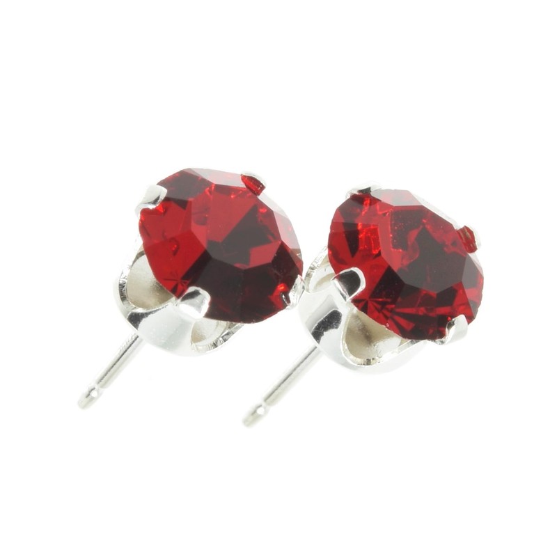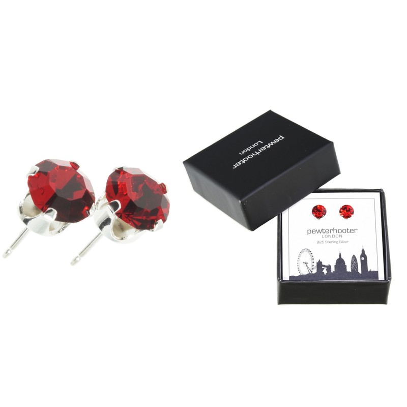 - pewterhooter London Collection stud earrings for women feature sparkling Light Siam Austrian crystal stones in a classic design. Each pair is made from sterling silver, measures 6mm x 6mm, and is stamped with '925.' They are presented in a beautiful gift box.