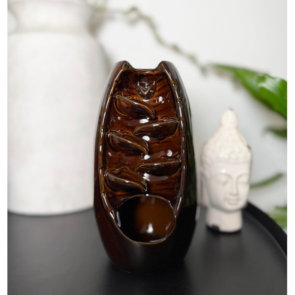 - DESIGN: Elegant ceramic waterfall-style backflow incense burner with a sophisticated brown glazed finish and sculptural aesthetic