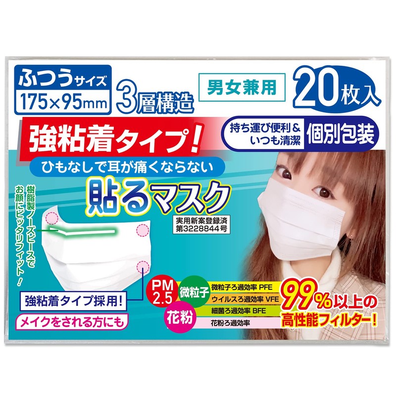 [あんしんや] 【強粘着】貼るマスク ひもなしで耳が痛くならない 男女兼用 PFE99%以上【20枚入】